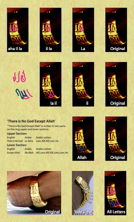 The photo above is very clear. Yet it does not give the same appearance of any discernible Arabic message. The clarity of the ring, in this photo, is so much different in detail that one would wonder if everyone was examining the same ring. If there is a message in the ring’s design, it cannot be seen in all of the photos, such as the high-resolution photo, and the message would only be known by the craftsman, who designed it, and by anyone whom the craftsman has informed on its meaning, such as the ring holder.